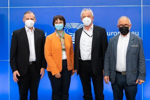 Auf dem Bild zu sehen sind (v.l.n.r.) Norbert Lins und die Berichterstatter Ulrike Müller (Renew, DE), Peter Jahr (EPP, DE) und Eric Andrieu (S&D, FR).